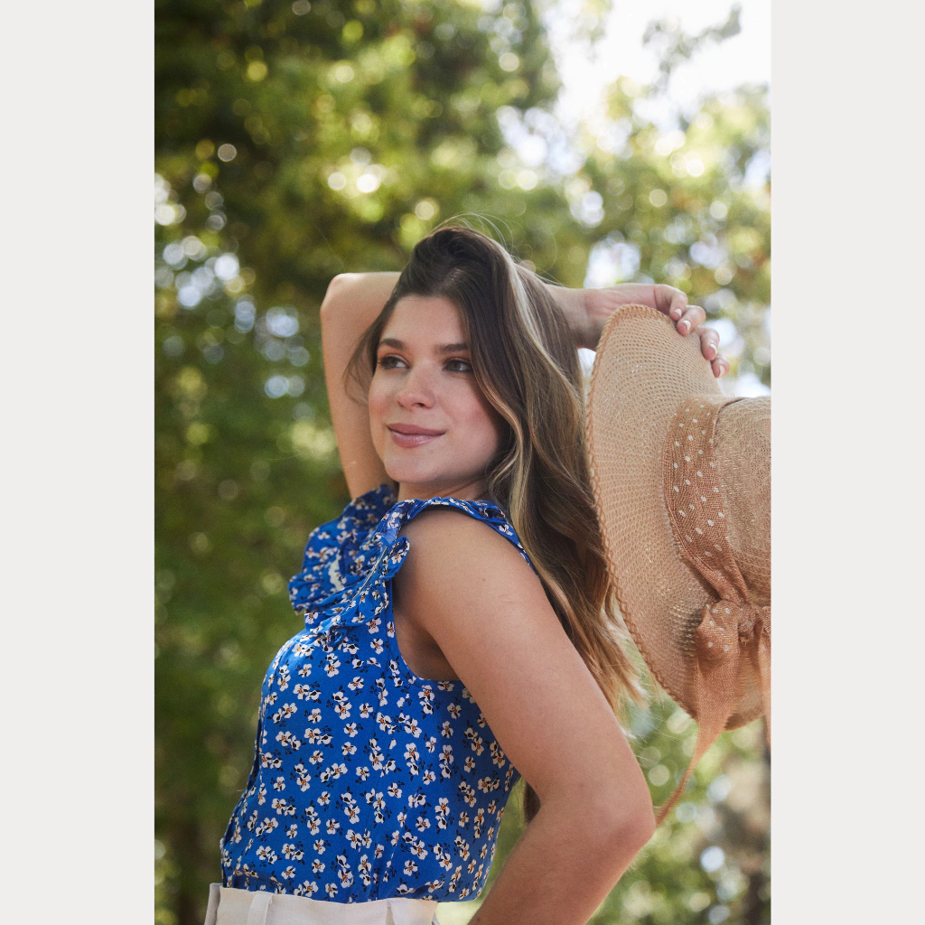 Camisa sin mangas con cuello baby y volado en todo su contorno, con detalle de cinta zigzag en contraste.