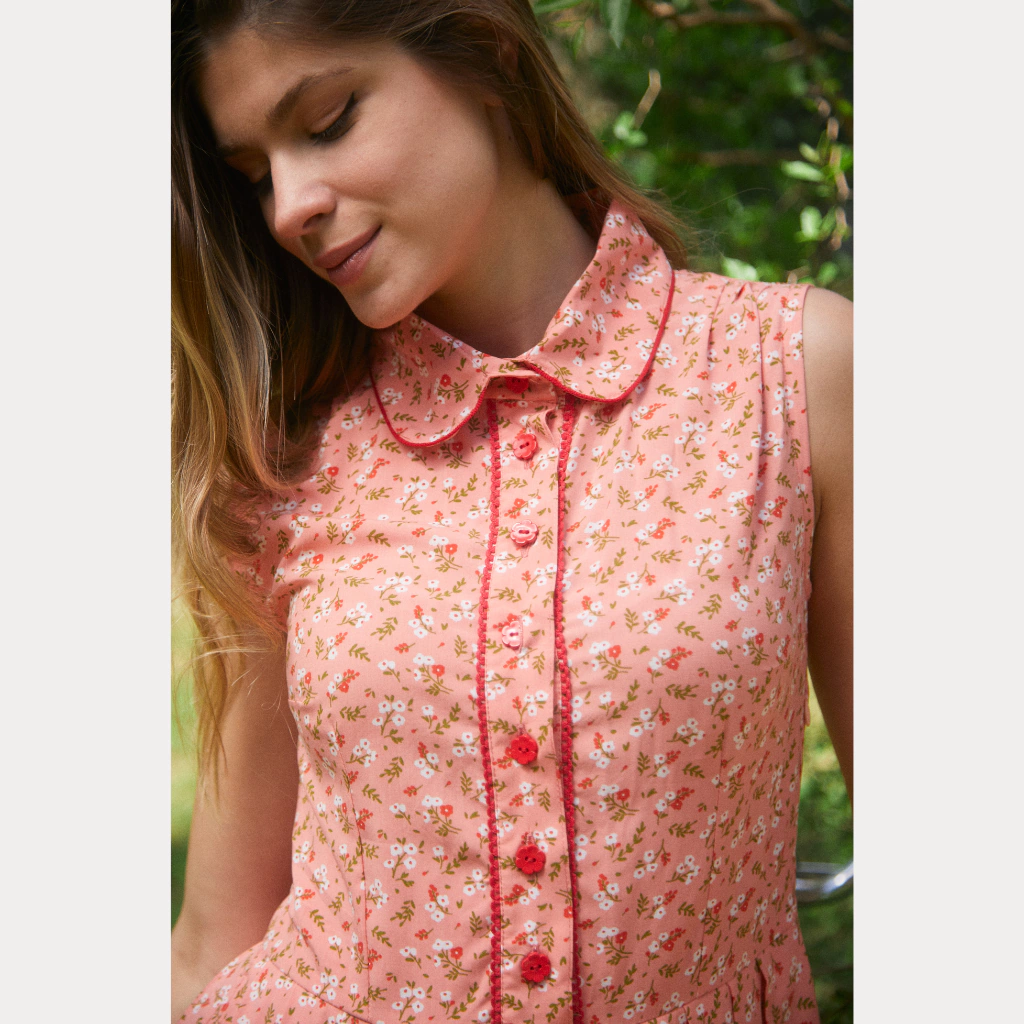 El cuello tiene terminación redondeada y está bordeado con un vivo al tono que combina armoniosamente con el estampado.