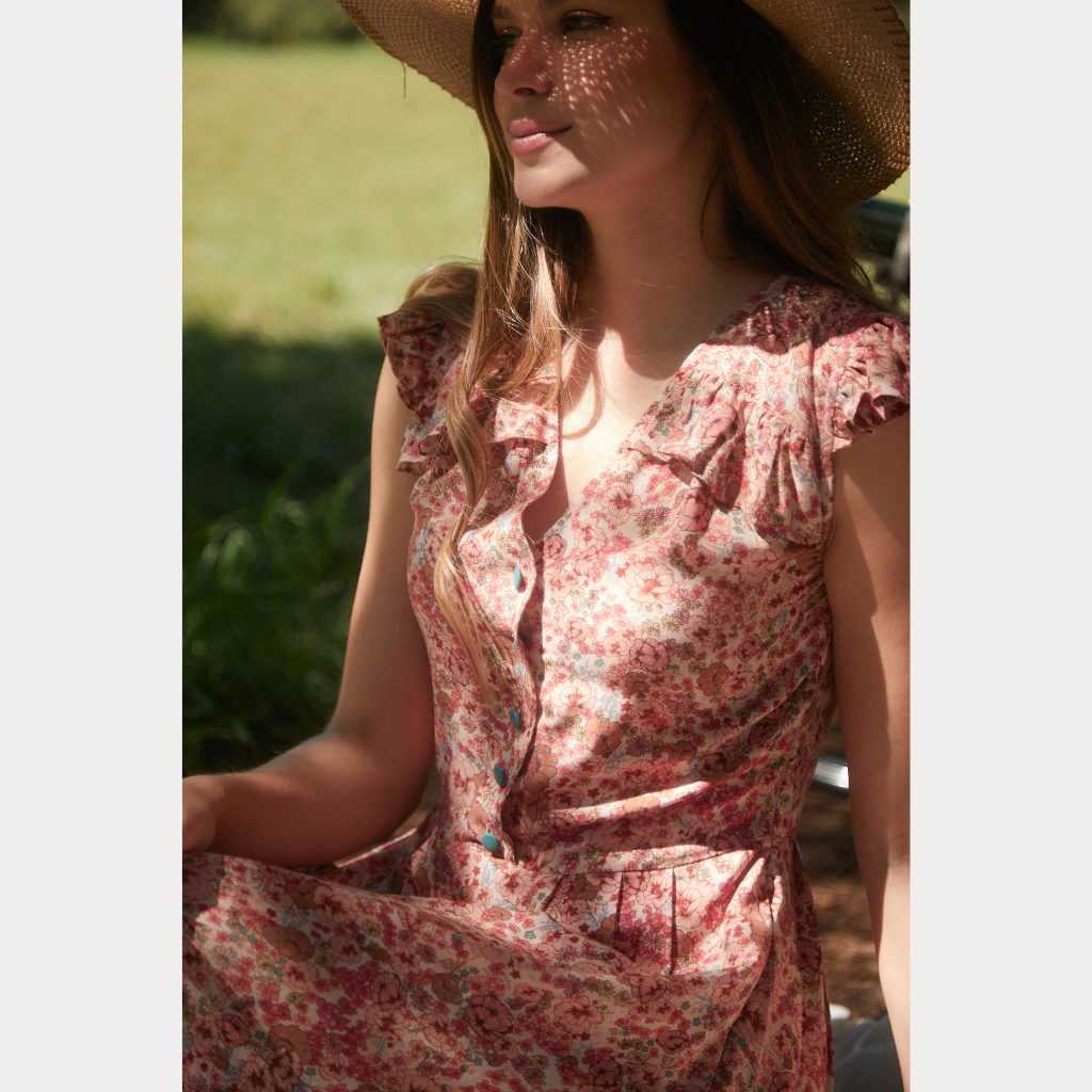 Corte a la cintura con delicado escote en V, recorte en los hombros con pequeño frunce y voladito que resalta la prenda.