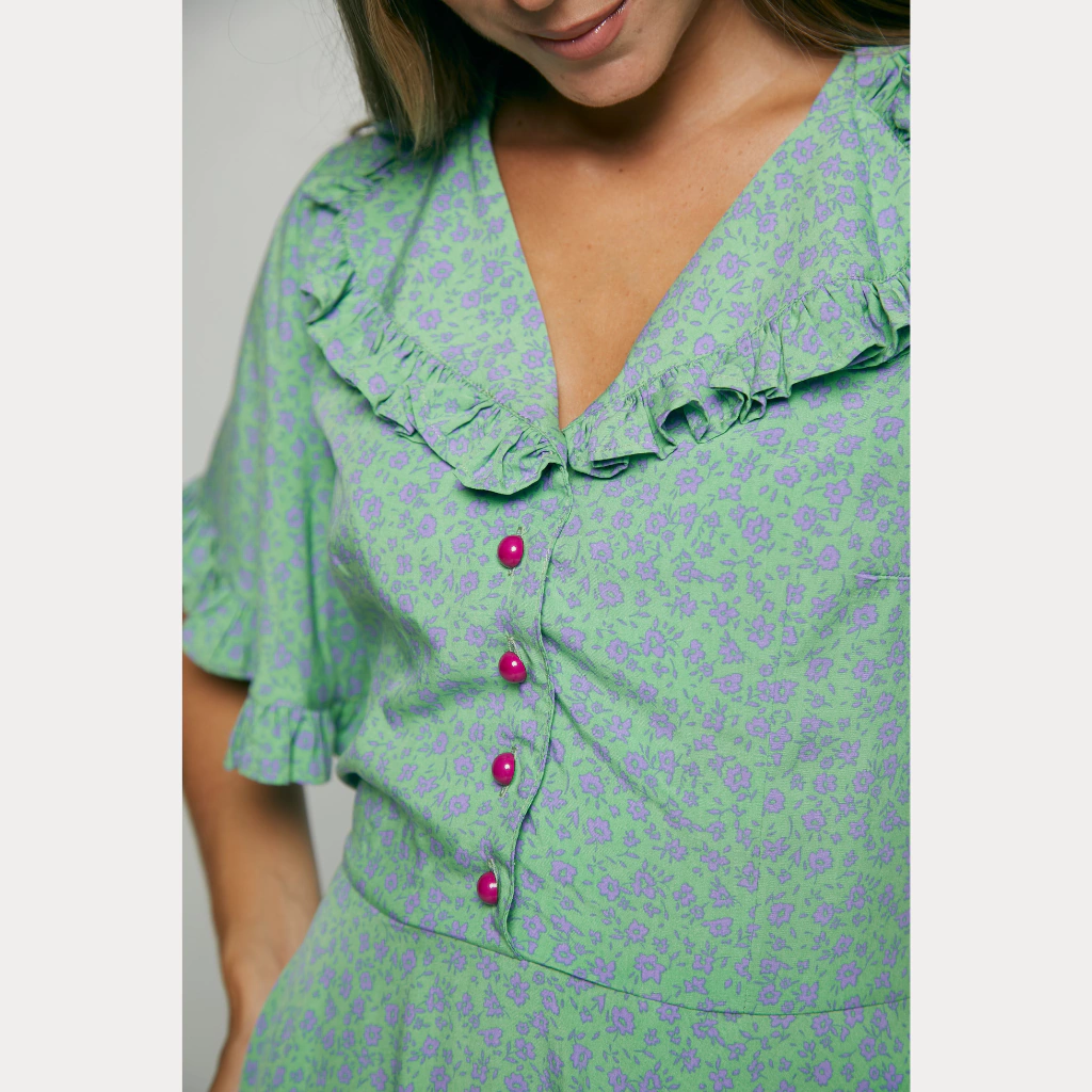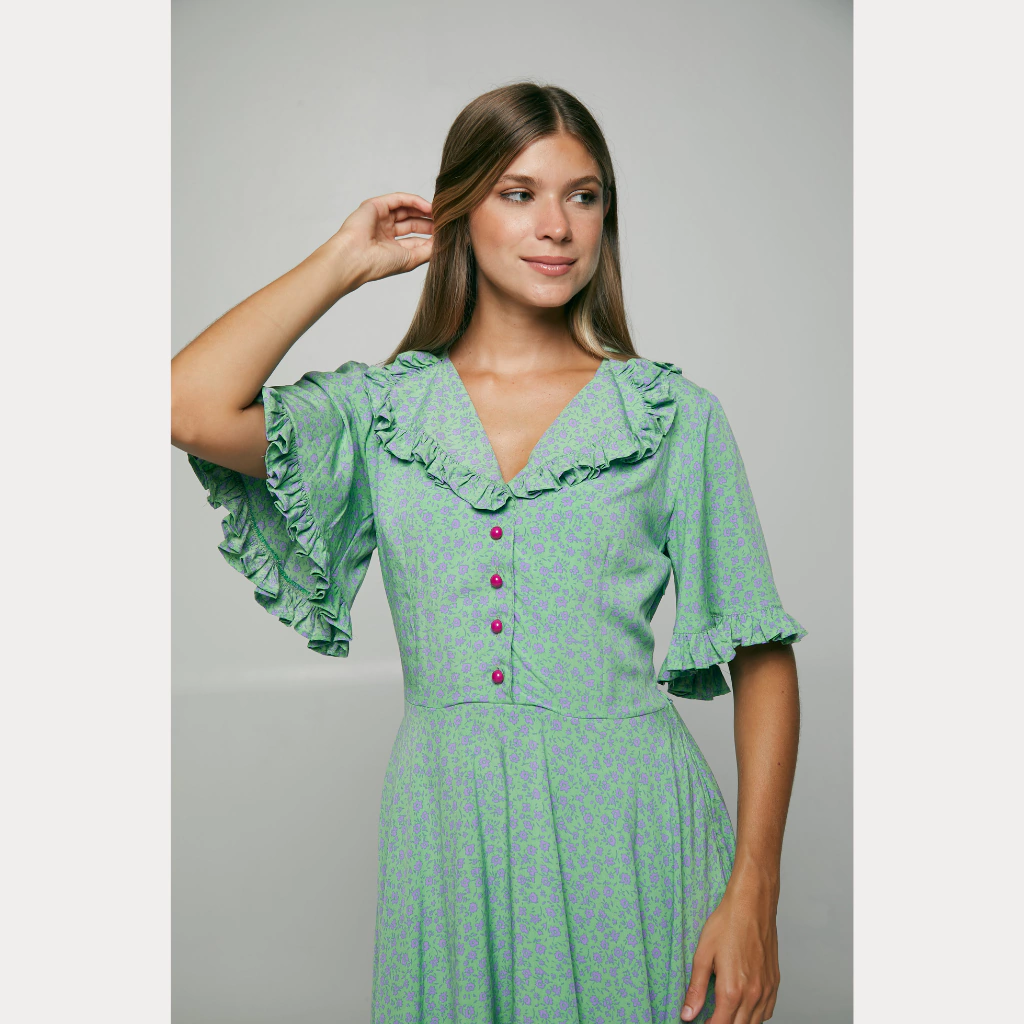 Corte a la cintura con delicado cuello en V con solapa, terminado con voladito en todo su contorno.