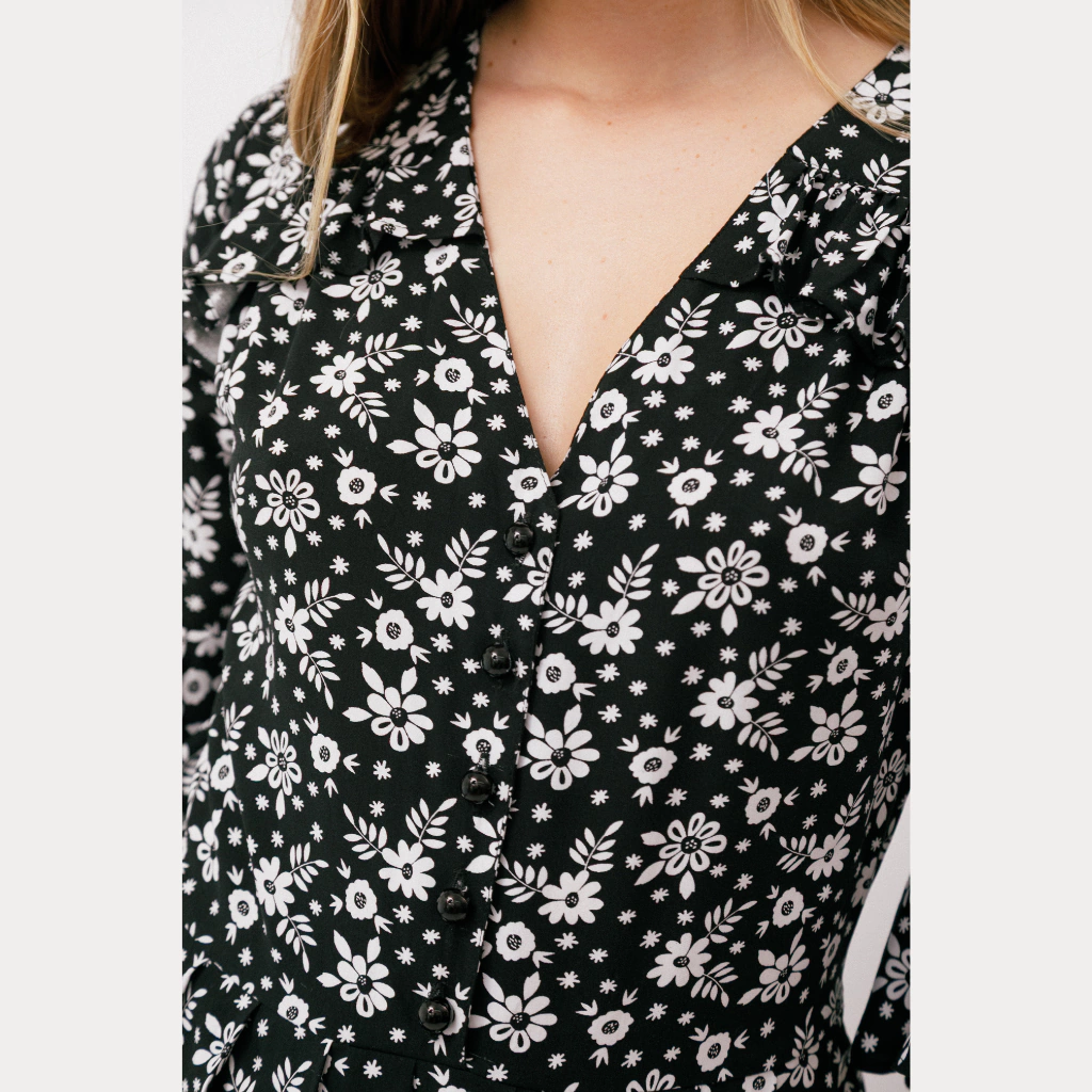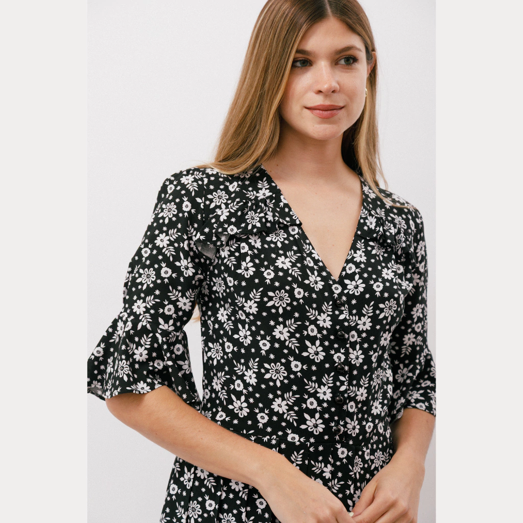 Modelo de corte a la cintura, con escote en V y cartera abotonada, acompañado de recortes en el hombro y voladitos.