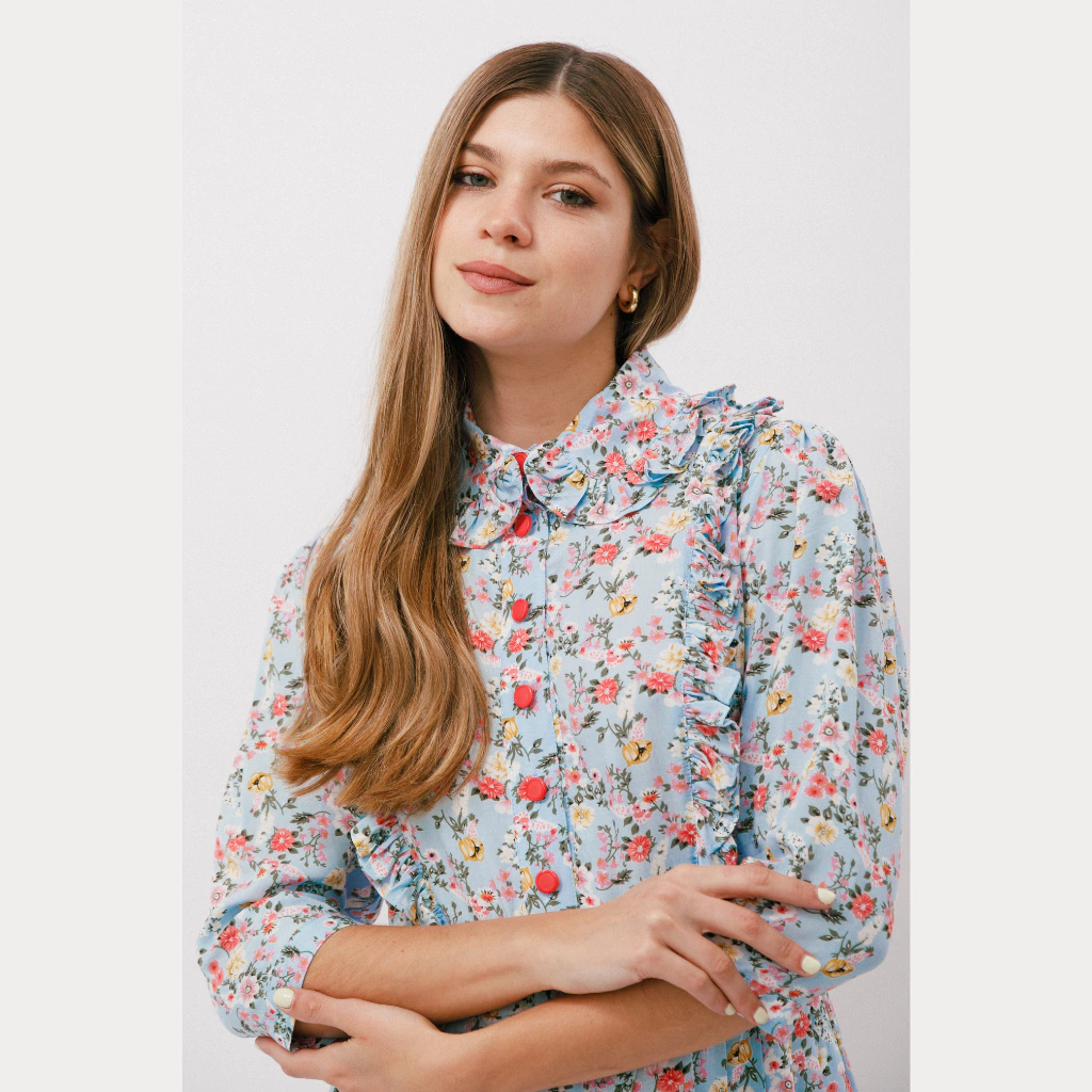 Camisero con corte en la cintura. El cuello tiene una terminación redonda con un pequeño voladito que lo rodea.